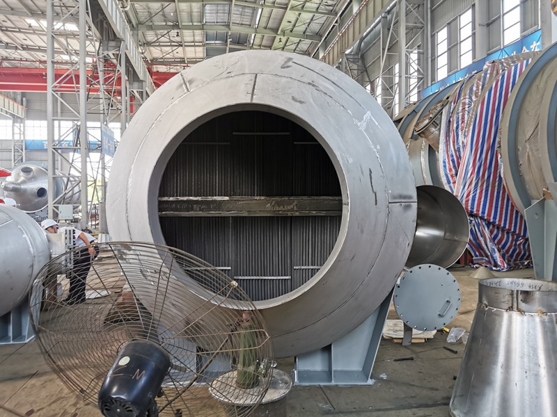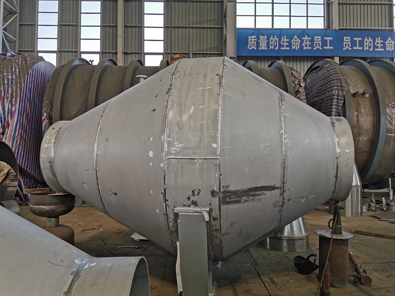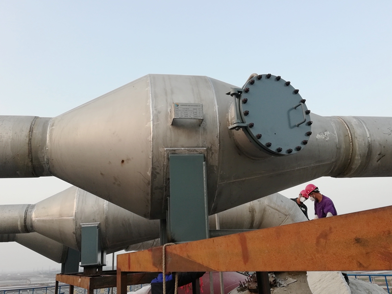 公司研发制造的制盐二次蒸汽净化装置,为防腐使用不锈钢复合板材料等新材料,包括筒体、联于筒体上下两端的二次蒸汽出口和二次蒸汽进口、设于筒体内的过滤层、冲洗管及联于冲洗管上的数个喷头。在筒体底部排水管过滤层设有数个扇形分区的格栅、置于每个扇形分区内的滤层,每个滤层均包括重叠压制的至少一层金属防腐丝网、至少一层非金属防腐丝网和至少一层炭纤维规整填料;过滤层在纵向位于二次蒸汽出口和二次蒸汽进口之间,数个喷头位于过滤层上方、通过脉冲阀控制冲洗液体。